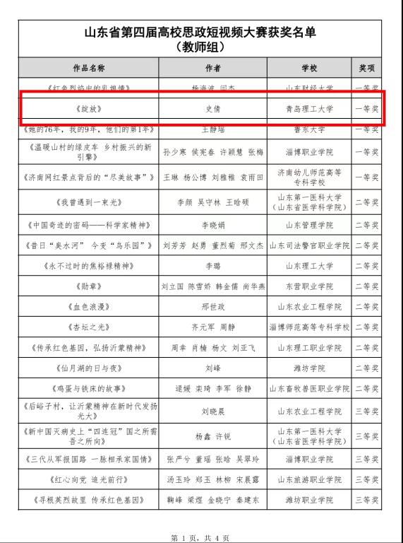 近日,山东省第四届高校思政短视频大赛公示了获奖名单,公司VSport体育史倩老师的《绽放》作品荣获教师组一等奖。