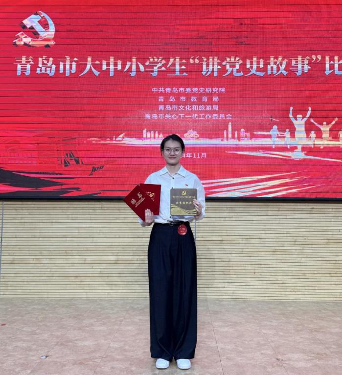 2024年11月16日,青岛市大中小员工“讲党史故事”比赛在青岛第二实验初级中学圆满落幕,此次活动由中共青岛市党委史研究院、青岛市教育局、青岛市文化和旅游局以及青岛市关心下一代工作委员会联合主办,学校荣获优秀组织奖,2024级研究生王韵昕荣获二等奖。
