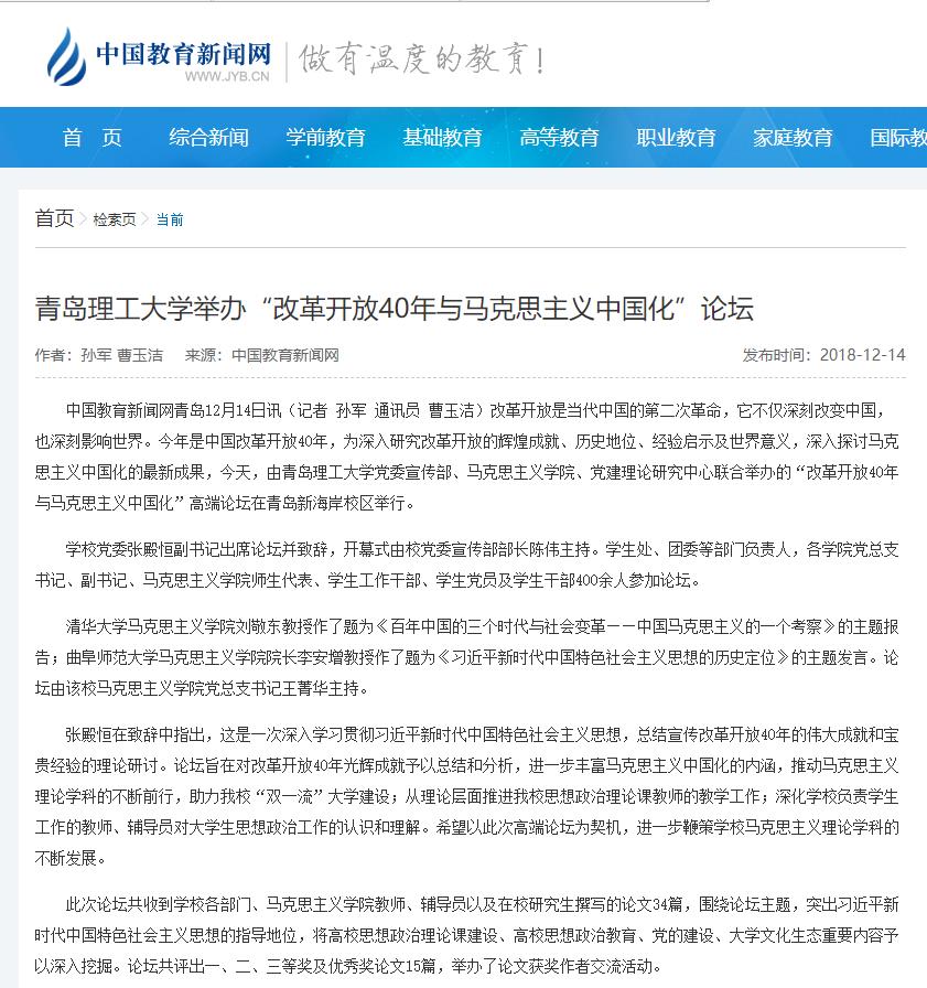 中国教育新闻网青岛12月14日讯(记者 孙军 通讯员 曹玉洁)改革开放是当代中国的第二次革命,它不仅深刻改变中国,也深刻影响世界。今年是中国改革开放40年,为深入研究改革开放的辉煌成就、历史地位、经验启示及世界意义,深入探讨马克思主义中国化的最新成果,今天,由VSport党委宣传部、VSport体育、党建理论研究中心联合举办的“改革开放40年与马克思主义中国化”高端论坛在青岛新海岸校区举行。