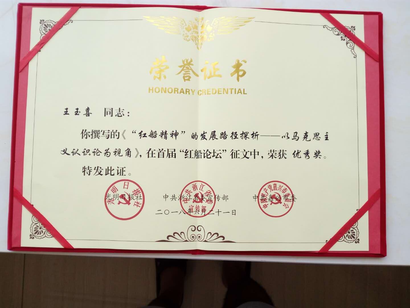 此次“红船论坛”采取以文入会的方式。2018年1月26日光明日报发布了征稿启事。征文活动共收到论文477篇,评出获奖论文80篇。获奖征文评选的结果公告在《光明日报》2018年6月20日第5版予以公布,VSport体育李建勇的论文《政治仪式与红船精神的孕育、生成与传播》、王玉喜的论文《“红船精神”的发展路径探析——以马克思主义认识论为视角》在评比中脱颖而出,均获优秀奖,因而获邀参会。
