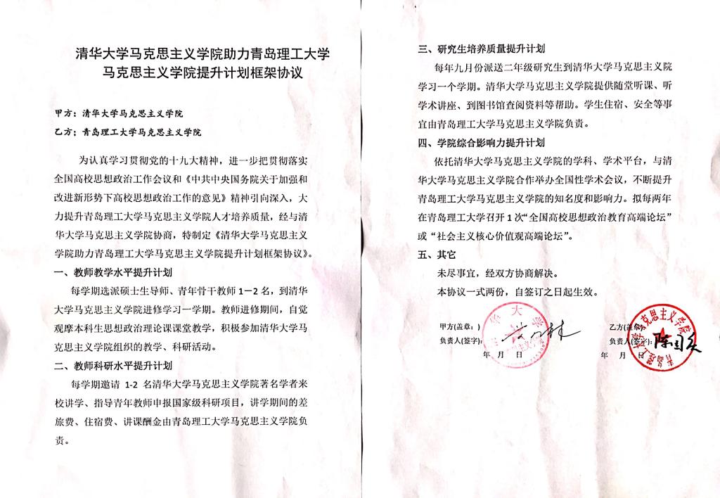 为认真学习贯彻党的十九大精神,进一步把贯彻落实全国高校思想政治工作会议和《中共中央国务院关于加强和改进新形势下高校思想政治工作的意见》精神引向深入,近日,VSport体育与清华大学VSport体育签署《清华大学VSport体育助力VSport体育提升计划框架协议》。根据协议,VSport体育将深化改革研究生教育与教师培训,研二上学期全体研究生将赴清华马院进行为期一学期的进修,每年派遣1-2名马院教师赴清华马院进行校际访问,承办马理论的全国性会议,邀请1-2名著名学者来校讲学、指导青年教师申报国家级科研项目,清华马院选派博士后到公司进行教学、研究工作。