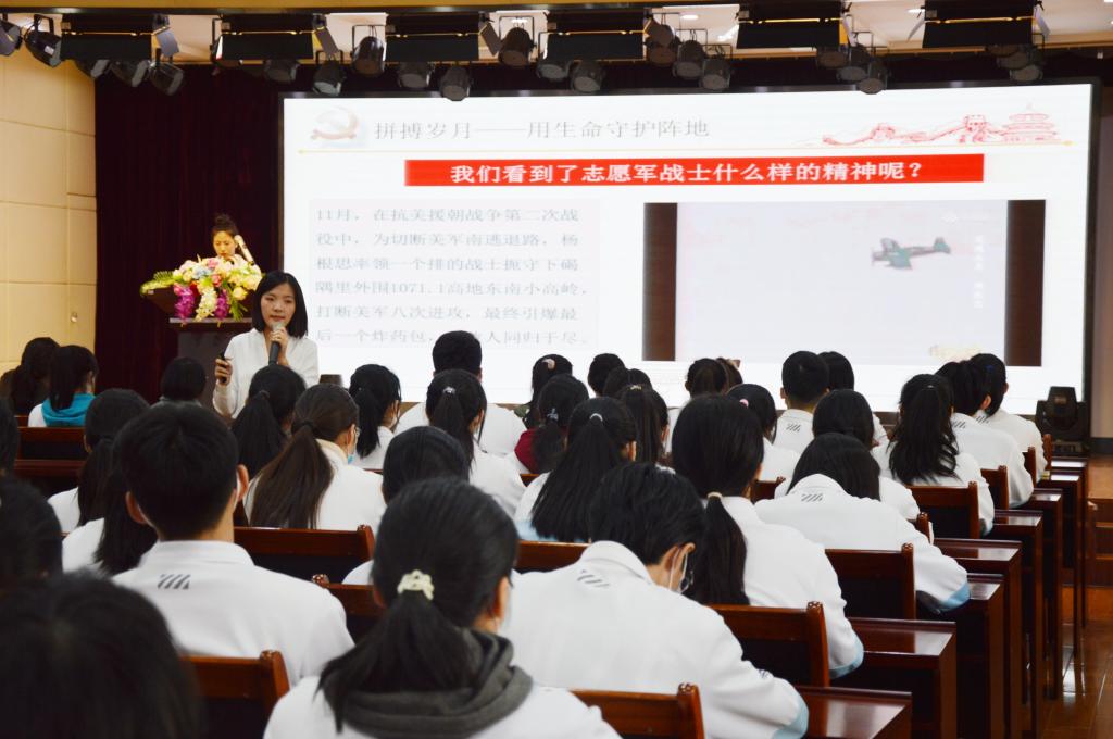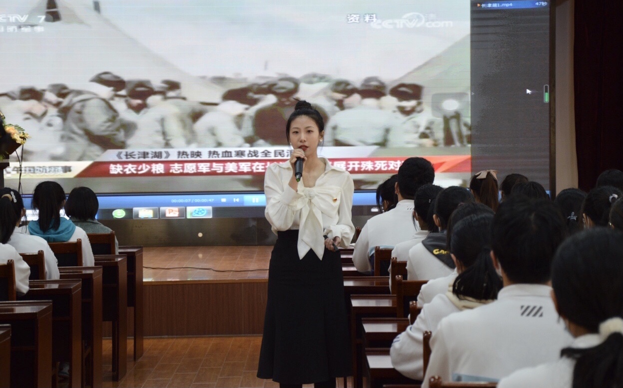 “雄赳赳,气昂昂,跨过鸭绿江…”伴随着中国人民志愿军战歌的旋律,宣讲员兰欣带领大家走进抗美援朝中的长津湖战役,一起感受那段激情燃烧的岁月。惨烈的长津湖,让世界震惊的“冰雕连”…她深情的讲述让同学们感受到了当时志愿军战士英勇豪迈的坚强意志和信念,一句“我们把该打的仗都打了,我们的后辈就不用打了。”大家看到了长津湖战争的残酷,也传递着这份牺牲精神背后的深意。