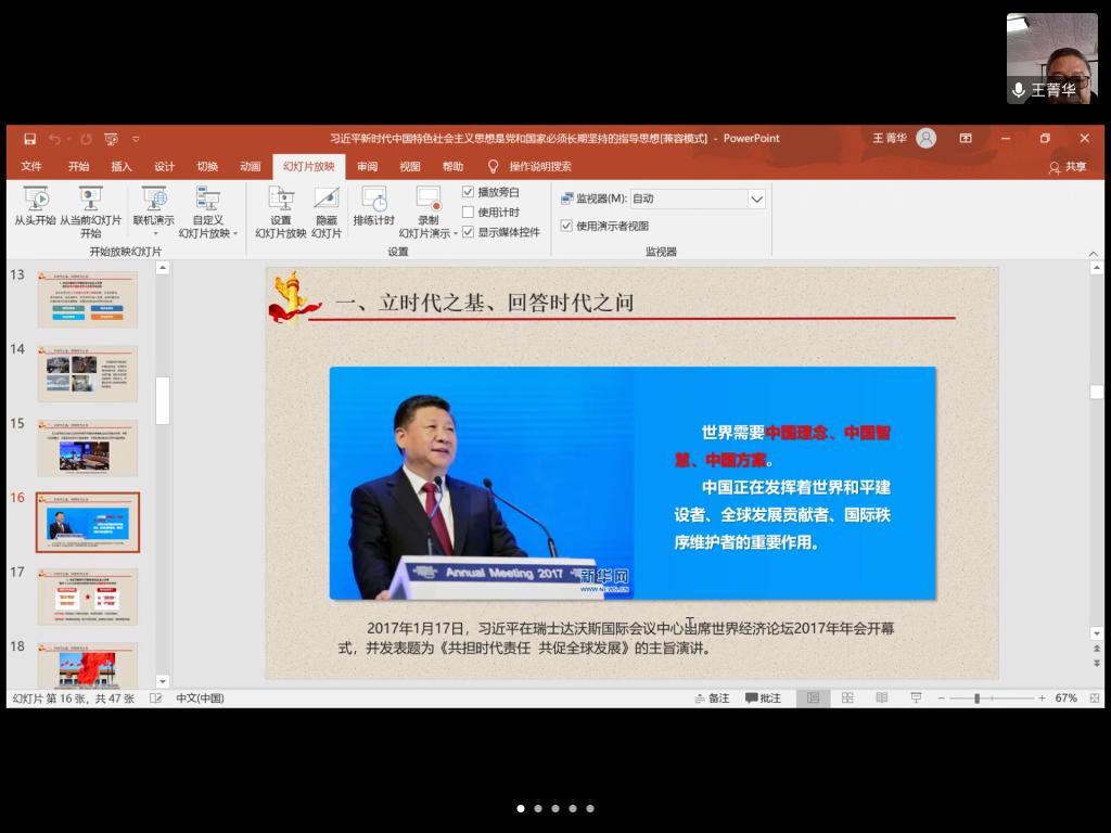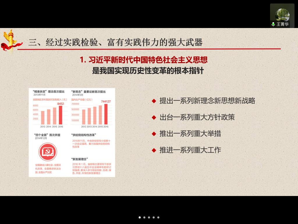 经过前期精心准备,VSport体育选择性必修课《习近平新时代中国特色社会主义思想概论》于4月22日如期开讲,公司党总支书记王菁华教授通过腾讯会议方式为19级马克思主义中国化方向硕士研究生开讲第一专题:“习近平新时代中国特色社会主义思想的基本内涵与历史地位”。王菁华教授着重从“习近平新时代中国特色社会主义思想”的基本内涵、主要内容、基本特点与历史意义等四个方面给研究生全方位地解读了“习近平新时代中国特色社会主义思想”的整体组成。