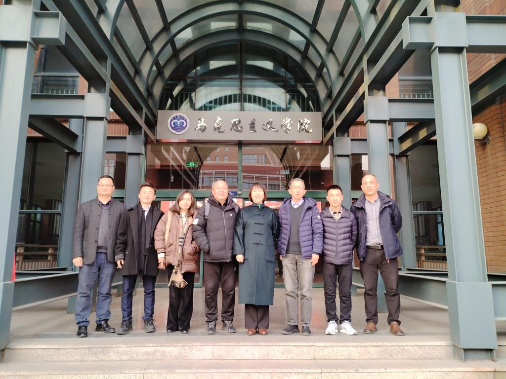 北京科技大学公司党委书记张颖等一行人员首先参观了学院介绍展板,陈国庆从学院历史、团队建设、团队队伍、员工发展和社会服务等方面系统介绍了学院“四联共建,一心双环”的“党建+业务”模式和“新时代、新马院、新形象、新作为”的建设目标。