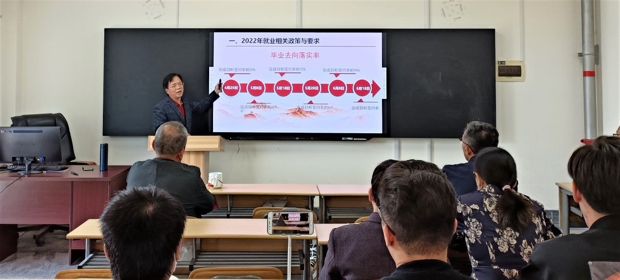 会议伊始,陈国庆详细介绍了本次会议流程,他强调学院要严格按照学校相关要求完成员工就业指导工作;员工要看清就业形势,转变就业观念,拓宽择业视野,寻找就业帮扶,并且在积极就业的同时,也要认真完成论文答辩工作。