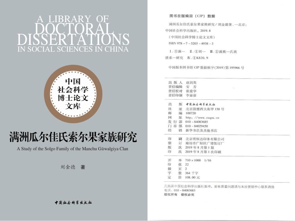 《满洲瓜尔佳氏索尔果家族研究》一书入选2018年度《中国社会科学博士论文文库》,2019年由中国社会科学出版社资助出版,出版后《历史档案》《满族研究》等刊物发表书讯书评予以推介。全书除绪论、参考文献、索引、后记外,由五章构成,近40万字。该书以满洲瓜尔佳氏索尔果家族为研究对象,立足于《清实录》等基础史料,充分运用满汉文档案、各类族谱,对索尔果家族兴起的社会历史背景,家族各支系的发展脉络、族人事迹、家族佐领、旗分和爵秩,以及婚姻关系和家族历史地位等问题予以分析考证,附录部分作者罗列了索尔果家族佐领、婚姻和封爵汇总表,以及家族谱系图。该书在充分尊重学术界研究成果的基础上,对族人事迹的考证极为精详,弥补了以往研究中的一些不足;对家族佐领、旗分变化的探讨是一个崭新的视角;对家族婚姻关系的梳理展现了清代满洲贵族间婚姻往来的政治意义。