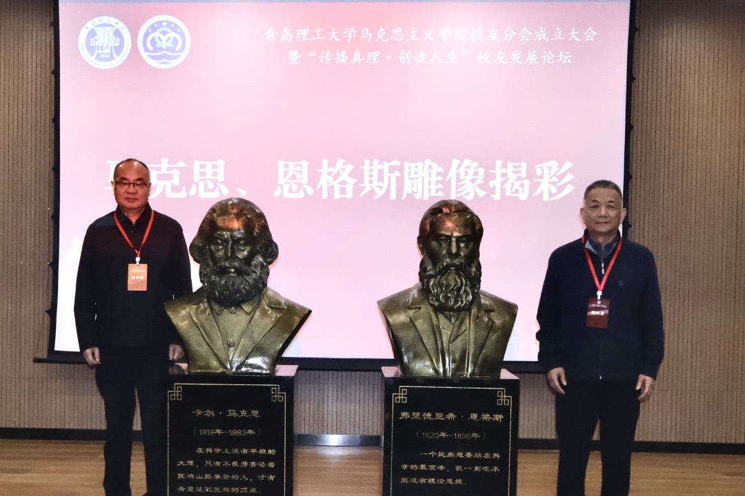 陈伟与谭业庭教授共同为马克思、恩格斯雕塑揭幕,这不仅象征着真理火种的赓续,也标志着员工分会新征程的开启。随后,与会人员共同观看员工代表录制的祝福短片,这份跨越山海传递着对母校与学院的深情眷恋,让现场洋溢着温馨浓厚的员工情谊。