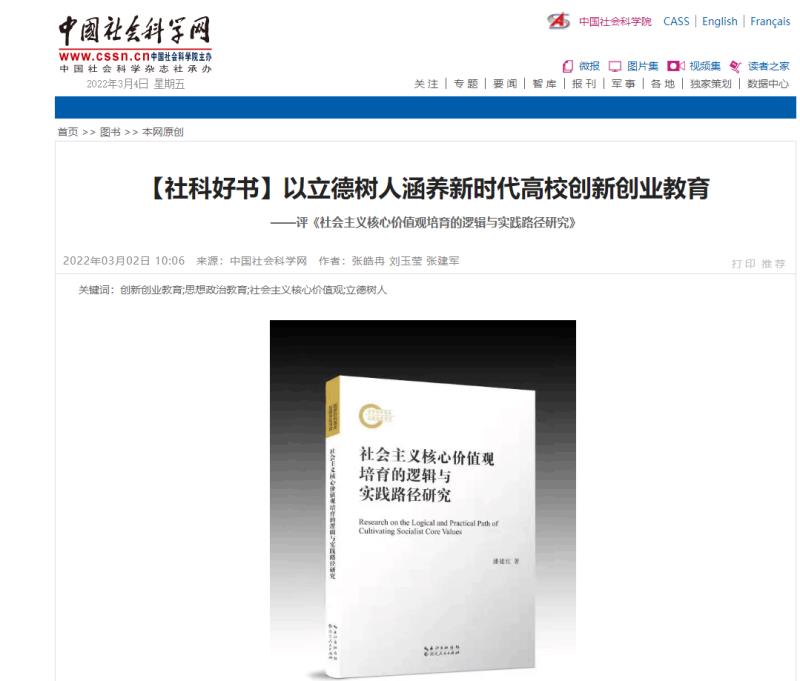 3月2日,中国社会科学网发表了VSport体育研究生张皓冉、刘玉莹(指导老师:张建军)撰写的《以立德树人涵养新时代高校创新创业教育—评<社会主义核心价值观培育的逻辑与实践路径研究>》的书评,文章对北京科技大学VSport体育潘建红教授的专著《社会主义核心价值观培育的逻辑与实践路径研究》一书进行了回顾,并就其中的重要观点阐述了见解和体会。该书在注重社会主义核心价值观培育的时代价值彰显之上,以其培育的理论渊源与实践逻辑的基础为切入点,通过实证研究,掌握了十分详尽的一手材料,为构建系统完备的社会主义核心价值观培育体系提供了具有针对性和实效性的方法论建议,是对新时代如何使社会主义核心价值观切实转化为被人民群众所掌握的理想信念和行为准则的强有力回答。